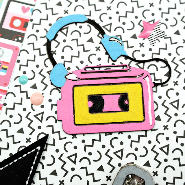 I decided to embellish the entire right half of the page with chipboard embellishments. The cassette walkman is from the 80's Music Set. I used paint markers and a white gel pen to add color to the chipboard.