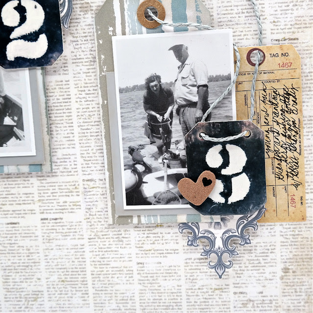Each Color Club Collection Kit includes at least three unique textures. I used several, but not all, on this page. I used the Sizzix Tag and Tie Die Set to cut three tags from patterned paper to use as photo mats. I added paint swatches, a number die-cut tag, a fussy cut brocade element, and a textured embellishment to each photo tag, separating some of the layers with 3D foam squares for dimension. The blue string, I used to connect all the tags on this layout, is from my stash.