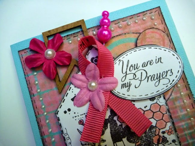 I embellished the bottom with the word "Pink," which I cut from Susan K. Weckesser Live In Color patterned paper, a pink flower, ribbon and some UmWow Studio chipboard. I finished the card with some pearl accents.