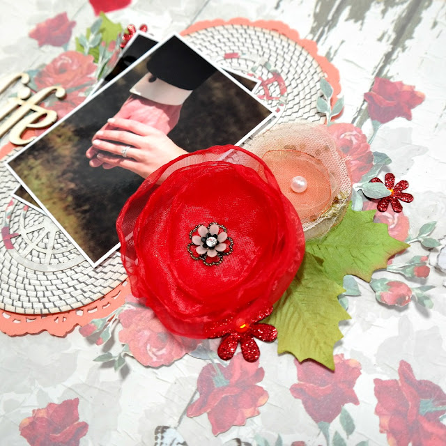 3. Layer the two orange doilies, the two Making Memories circles, two window die-cuts (Carder's Pack), and two wallet size photos, on the center of the Love Grows Here patterned paper, just to the left of the red roses.