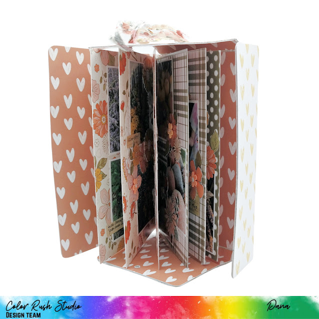 I covered both the outside and inside of the folio with the heart print papers from the kit because I just love fall. Two of my favorite embellishments from the kit are the Frazzles Ribbon Collection and the Boho Macrame Rainbow. The folio is held shut by a plain black band. I used a length of ribbon and the rainbow to cover the basic band and to add a bold print and pop of color to the front of the folio.