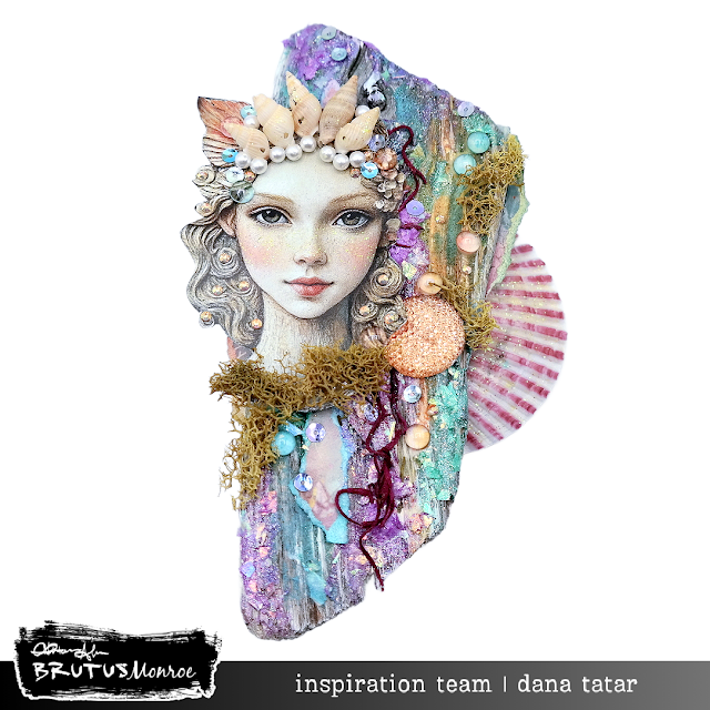 Hi! I upcycled a piece of driftwood into an enchanting wall hanging for Brutus Monroe. I look forward to the mermaid themed release every year. In addition to three paper collections, three new formulas of color mediums are available! If you're looking to add beachy texture to your projects in a summery color palette, this is the release you have been looking for!